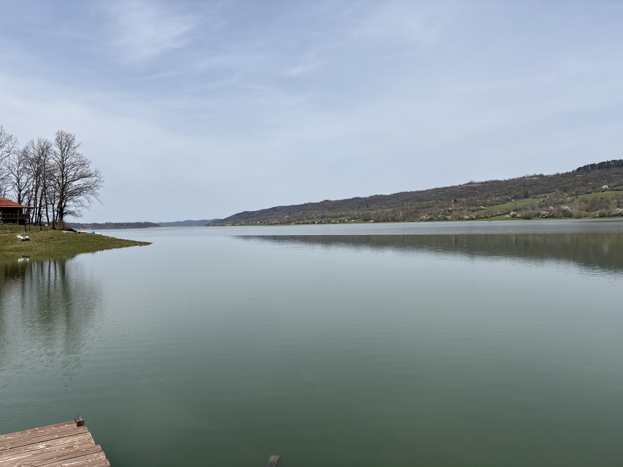 The image depicts a serene lake scene in Golyama Zhelyazna, Bulgaria. The water is calm and greenish-grey, reflecting the overcast sky. In the foreground, a wooden dock extends partially into the water. To the left, a grassy bank features a small structure and bare trees, their branches casting reflections on the water. Across the lake, a gently sloping hillside is visible, dotted with trees and sparse vegetation. The sky is pale and cloudy, with no distinct features. The overall atmosphere is quiet and peaceful.
