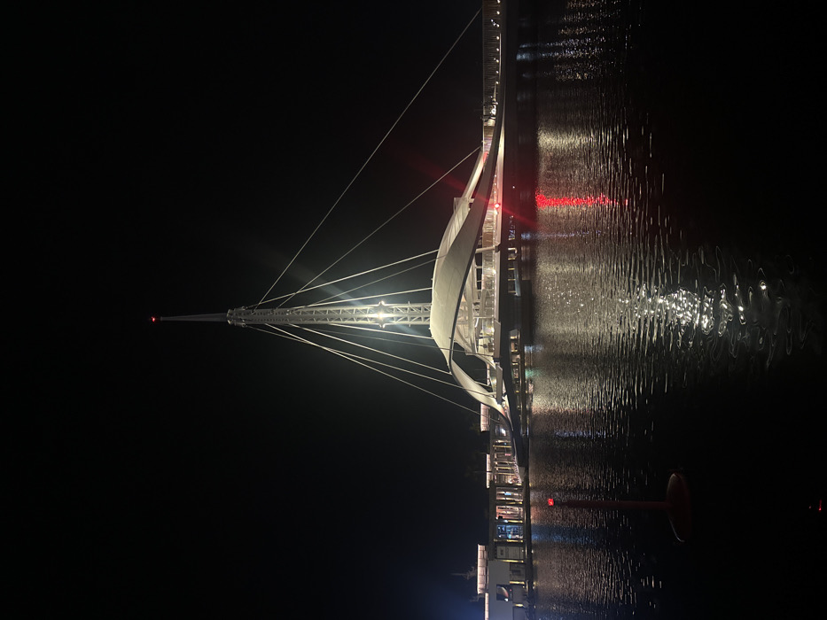 This nighttime image depicts the Kaohsiung Pop Music Center Love River Bay Bridge in Kaohsiung, Taiwan, illuminated against a dark sky