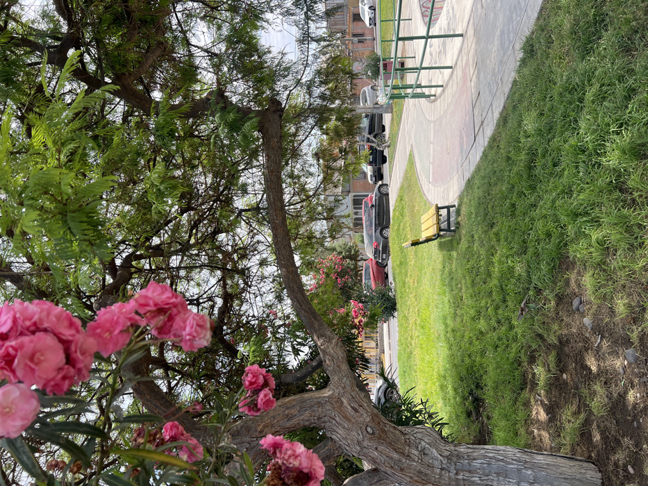 A sideways view of a park area with green grass, a sidewalk, and a bench. Several cars are parked along the street in the background, near an apartment building. A tree with pink flowers is in the foreground. The sidewalk has green railings.