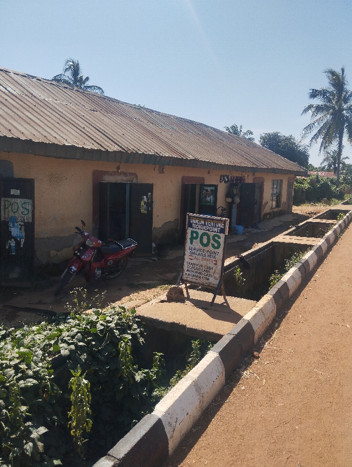 An exterior scene in Unguwan Rimi, Nigeria, depicts a single-story, light brown building with a corrugated metal roof under a clear blue sky. A red motorcycle is parked on the unpaved ground in front of one of the building's multiple dark, open doorways. A white A-frame sandwich board sign, labeled "GNDEUM VENTURE MONIEPOINT POS," lists services including "TRANSFER CASH," "DEPOSIT-CASH," and "WITHDRAW-CASH" for "ALL BANKS." To the left of the building, "POS" is painted on a dark rectangular surface. A concrete curb, painted with alternating black and white segments, separates a dirt road from an overgrown drainage ditch in the foreground. No individuals are present.