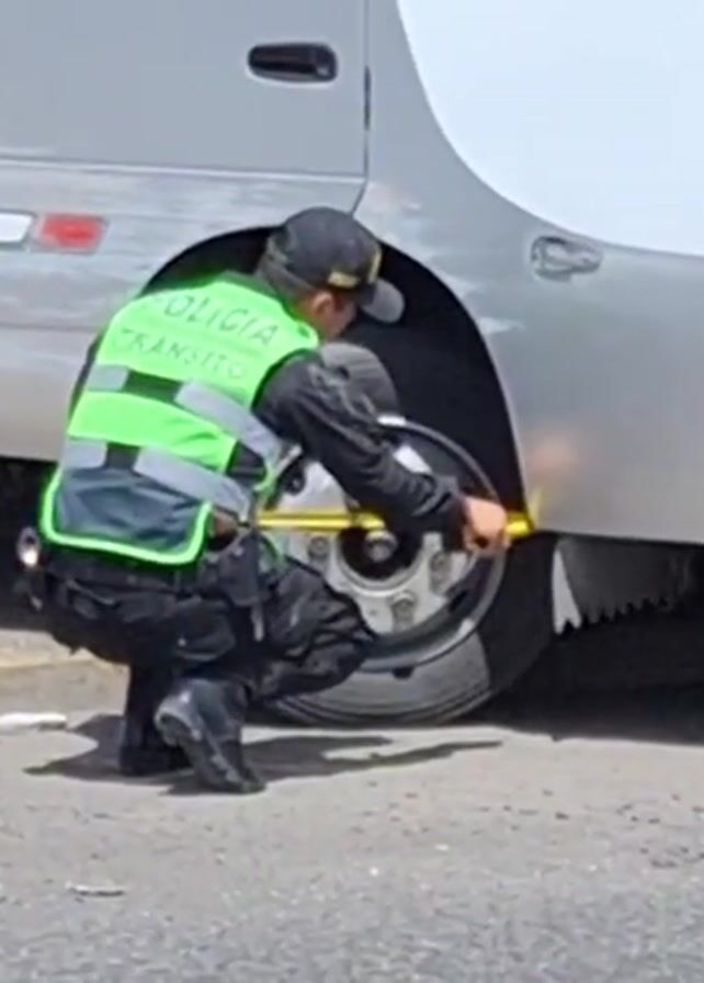 policeman inspecting the aftermath of an accident. The officer, wearing a black uniform and a bright green traffic vest, is seen measuring the tire of a white and silver bus with a yellow measuring tape. The bus appears to have crashed into a wall, and a motorcycle is also visible, parked close to the damaged area. The scene is marked with red signs labeling "POSICION FINAL" (Final Position) and codes "UT-1" and "UT-2". The overall setting suggests an accident site that is being investigated.
