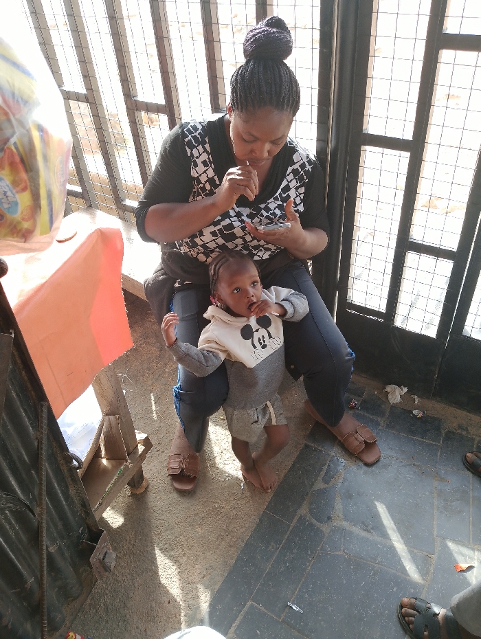 An adult female and an infant are present in an outdoor environment in New Nyanya, Nigeria. The adult female, with braided hair in a high bun, wears a black and white patterned long-sleeved shirt, dark trousers, and brown sandals. She is seated, looking downwards, holding a light-colored smartphone in her left hand and a small, light object near her mouth with her right hand. The infant, wearing a grey and cream long-sleeved top with a Mickey Mouse graphic and grey shorts, stands barefoot between the adult's legs, looking towards the viewer. To the immediate left, a makeshift wooden stand supports a transparent plastic bag containing various colorful items, with a reddish-orange cloth draped over part of the stand. A corrugated metal structure is partially visible on the far left. The background consists of a black metal security gate or grille. The ground beneath the individuals is packed dirt, transitioning to dark grey tiled pavement in the foreground on the right, where scattered litter is visible. Strong sunlight illuminates the scene, casting distinct shadows.