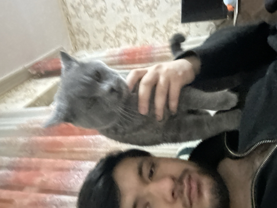 The image depicts an indoor scene in the city of Fergana, Uzbekistan, featuring one human and one feline subject. A young adult male is visible on the left side of the frame, facing forward, with dark hair and facial stubble. He wears a dark, possibly zippered, garment, revealing a glimpse of his chest or an undershirt. His right hand is seen holding a grey-furred cat, which is positioned on his shoulder or upper chest. The cat, appearing to be a British Shorthair type, has a neutral to slightly downturned expression, looking away from the camera. The background consists of patterned curtains, predominantly light-colored with vertical folds or stripes in shades of pink, orange, and white/beige, situated behind the subjects. To the right, a wall covered with light-toned, floral-patterned wallpaper is visible. On the far right, a dark, rectangular object, possibly an electronic screen or monitor, rests on a surface, with a small, indistinct blue and orange object nearby. The lighting in the room is consistent with indoor ambient conditions.
