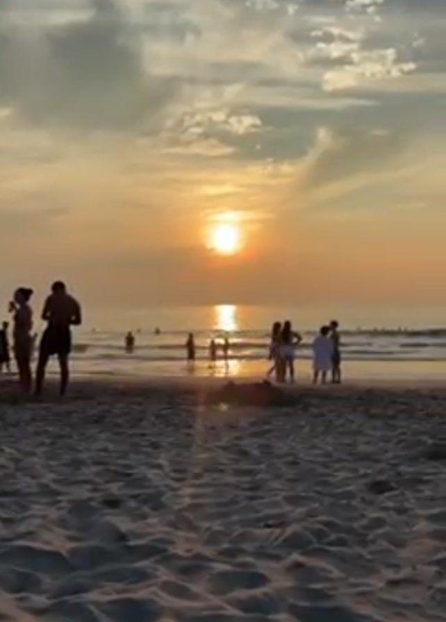 sunset at a beach. The sun is setting over the ocean and is casting a warm glow on the sand and the water. There are several people on the beach, some of whom are standing at the water's edge. Some people are further out in the water. The sky is partly cloudy. The sand is a light color and appears to be textured. The overall mood is peaceful and serene.