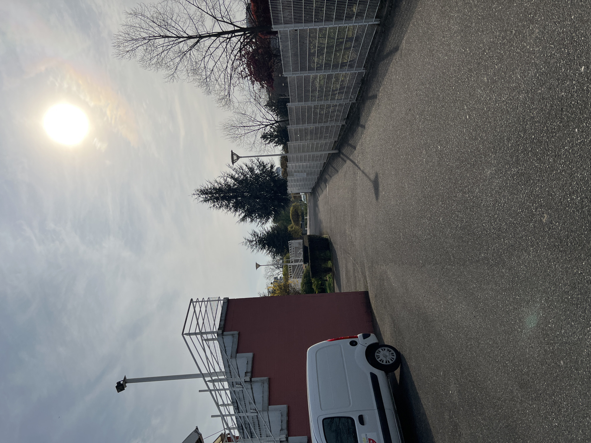 The image captures an outdoor scene in Schiltigheim, France, under partially cloudy skies with the sun prominently displayed in the upper right. A dark asphalt-paved pathway extends from the foreground into the distance, narrowing as it recedes. On the left side of the frame, a red-painted concrete structure is partially visible, featuring an external staircase with white metal railings. A tall, light-colored pole topped with a floodlight fixture projects upwards from behind this structure, reaching towards the top left of the frame. A white panel van is parked in the lower left, positioned alongside the red concrete structure. A red and white emblem is partially visible on the van's side panel. Along the right side of the paved pathway, a light-colored metal mesh fence extends into the distance, running parallel to the path. Beyond the fence and further down the path, various trees are visible, including dark green coniferous trees and several deciduous trees, some appearing bare-branched, while one displays reddish-brown foliage. Multiple streetlights are present, including a tall pole with a modern, cone-shaped lamp fixture in the mid-ground, casting a shadow onto the asphalt. Manicured hedges and other greenery are visible in the background, bordering the path beyond the immediate structures. No individuals are present in the scene.