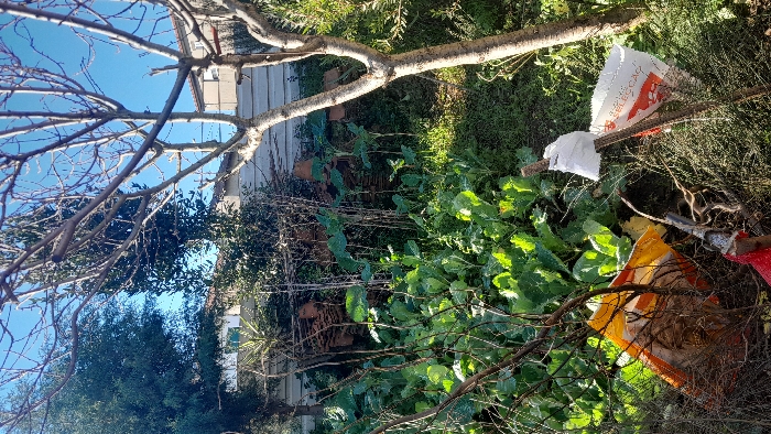 This image depicts an outdoor garden or cultivated area in Vila Nova de Famalicão, Portugal, under clear blue skies and bright sunlight. No individuals are present. The foreground features an assortment of dried branches and sparse green foliage. Partially obscured on the lower left is a crumpled yellow/orange bag. To the right, a slender wooden stake is visible, its upper section wrapped in white cloth. Adjacent to this, a white bag with red lettering, possibly reading "SELECÇÃO," is attached to another upright support. A portion of a red object is visible at the very bottom left. A tree trunk with light, mottled bark occupies the right edge, extending upwards with bare, branched limbs. The midground is dominated by a dense growth of vibrant green leafy plants, consistent with a vegetable garden. Behind these plants, a structure composed of sticks and branches, possibly a trellis, is present, along with several stacked reddish-brown objects resembling terracotta pots or tiles. The background shows a clear blue sky. The tops of various trees with dark green foliage are visible. A light-colored building with horizontal siding or panels is partially observable behind the vegetation, bordering a lighter fence or wall that extends across the scene horizontally.