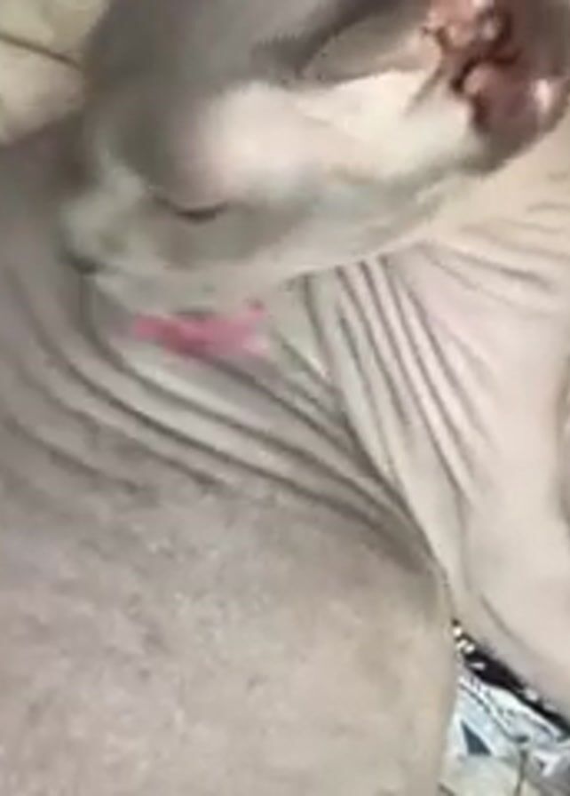hairless Sphynx cat lying on a bed. The cat is grooming itself by licking its body. The bed has a pillow with a blue and white pattern. A person wearing a black shirt is sitting nearby. The lighting is soft and the focus is on the cat.