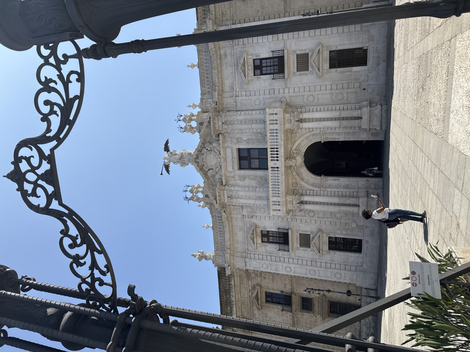 A detailed view shows the facade of a white building adorned with windows, decorative carvings, and a central arched entrance. A statue with angelic wings sits above the entrance. To the left and bottom, ornate black metalwork frames the scene. A person stands to the right of the building, seemingly taking a photo with their phone. A sign and some greenery are visible in the bottom right corner. The sky is bright blue.