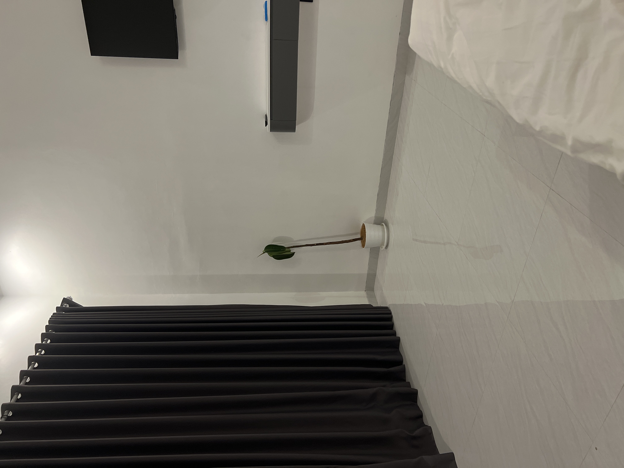 The image depicts an indoor scene with a partial view of a room. Visible elements include a dark television mounted on a white wall, a grey vertical panel, a white bed, a white tiled floor, dark grey curtains, and a small plant in a white pot. The location is Kutuh, Indonesia, based on user instructions. There are no people, subjects, actions, or interactions explicitly captured in the frame. The environment appears to be a bedroom or similar living space.