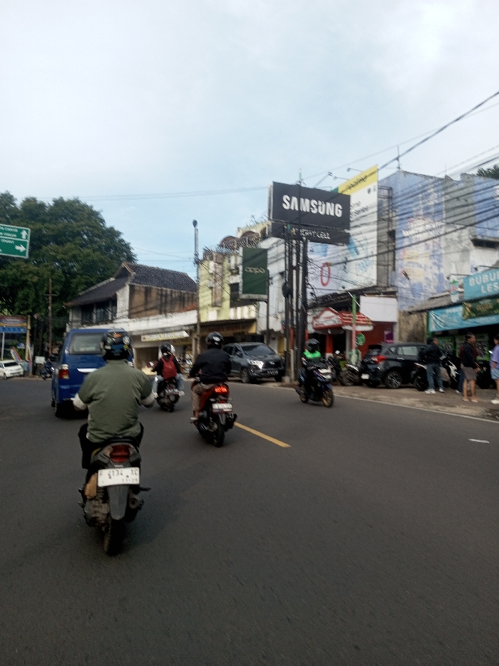 The image displays an active urban street scene. Based on the visible Indonesian license plate "F 1334 XC" on the foreground motorcycle and characteristic architecture and signage, the location is an urban area in Indonesia, not Phonsavan, Laos. The perspective is from behind a dark-colored scooter, which is moving away from the viewer on a dark, paved road. The rider wears a green long-sleeved shirt and a helmet. Behind this scooter, two other scooters are visible, also moving away; their riders wear helmets and dark clothing, with one carrying a red bag. A blue van is partially visible on the left side of the road, moving in the same direction. The right side of the street features a row of multi-story commercial buildings. Prominent signage includes a large black "SAMSUNG" billboard with "BY TELKOMSEL" below, a green "OPPO" sign, and a light blue sign partially reading "BUBUR LES". Several dark-colored cars, including SUVs, are either parked along the curb or moving slowly in the mid-ground. A group of approximately 3-4 pedestrians is standing on the sidewalk near a shop entrance on the far right. Numerous overhead electrical and communication cables are visible crisscrossing the street. On the far left, a green directional road sign with white text and arrows is partially obscured by trees. The sky is overcast and light blue, indicating daytime conditions.