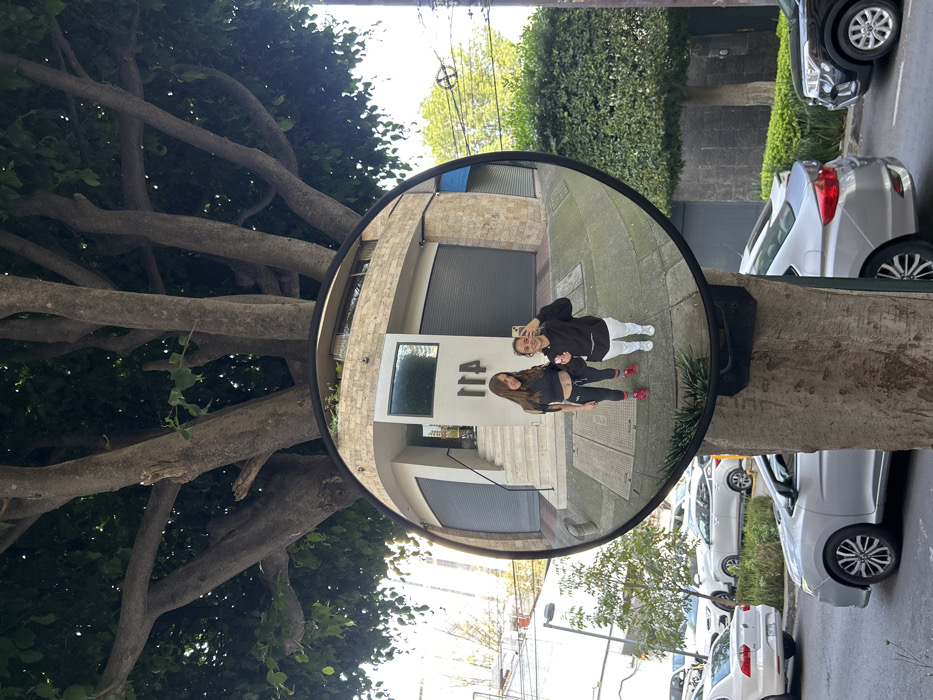 A circular convex traffic mirror is mounted on the trunk of a large tree, dominating the center of the image. The tree features multiple thick, greyish-brown trunks and dense green foliage overhead. Within the mirror's reflection, two young adult females are visible, positioned on a sidewalk. The female on the left has long, light brown hair and wears a black off-the-shoulder crop top, black athletic pants, and red athletic shoes. The female on the right has shorter, light brown hair and wears a black hooded sweatshirt over a white shirt, white pants, and white athletic shoes. She holds a dark-colored smartphone in her right hand, angled as if taking a selfie, and a small white object in her left hand. Behind the two individuals, the reflection shows the ground floor of a modern building with a light-colored, textured stone or brick facade. Two dark grey roll-down security shutters cover ground-level entrances. A central entrance features a short flight of white steps with a black handrail. The address "114" is clearly visible in dark numbering above the central entrance. The reflection also includes segments of a concrete sidewalk, power lines, and distant green foliage. Outside the mirror's reflection, the lower portion of the image reveals a paved urban street with parked vehicles. A silver Honda sedan is prominently positioned in the foreground. Other vehicles, including a white sedan and a black SUV, are partially visible. Green shrubbery and trees line the street in various areas. The scene depicts an urban street environment located in Mexico City, Mexico.