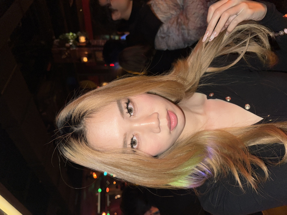 A female individual of East Asian descent is depicted in a posed, front-facing portrait within a dimly lit indoor establishment in Liangjiang, China. Her gaze is directed at the camera. She has long, layered blonde hair with dark roots, featuring distinct green and purple highlights on the viewer's left side. Her eyes are light brown, likely due to contact lenses, enhanced by visible eyeliner and long eyelashes. She wears a black long-sleeved top with a buttoned placket. Her left hand, with long, manicured nails featuring a light design, gently touches her hair. A pink beaded bracelet is visible on her left wrist. The background is blurred, showing ambient colored lights (red, green, blue, orange) and indistinct figures of other patrons, consistent with a bar or similar social venue during evening hours.