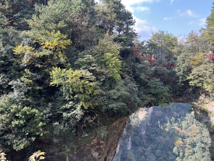 A natural stone bridge connects two cliff edges, densely covered in greenery. Varied trees and shrubs cloak the rock formations, with hints of fall colors. A deep valley lies beyond, also filled with lush vegetation. The sky above is partly cloudy, indicating a bright day. The scene evokes a sense of natural beauty and serene isolation.