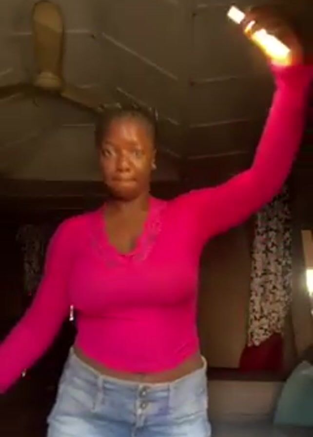 A young Black woman wearing a bright pink long-sleeved top with lace trim around the neckline and a short denim skirt is recording herself in what appears to be a living room. She holds her phone above her head with one arm raised, using the front-facing camera to capture the video. The room's interior features a dark ceiling with a ceiling fan, patterned curtains, and a sofa. Her expression is serious as she poses for the camera. The lighting is somewhat dim, but her attire stands out against the background.