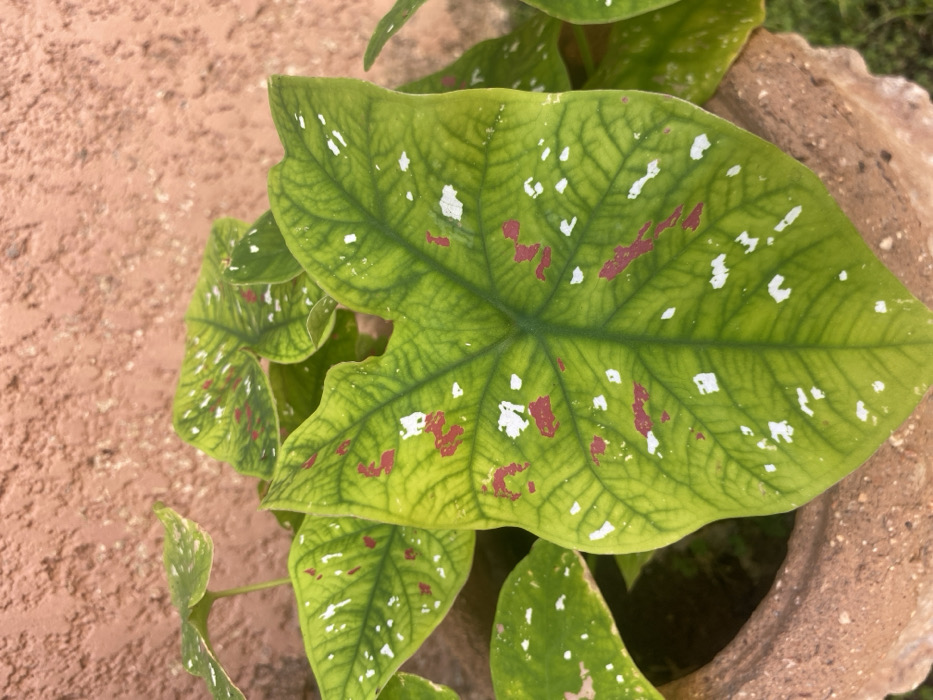 - "A Caladium plant, featuring distinct light green, heart-shaped leaves mottled with irregular white and reddish-pink variegations, is contained within a reddish-brown, unglazed terracotta pot" by FM-qtG7Q2, licensed under CC BY 4.0