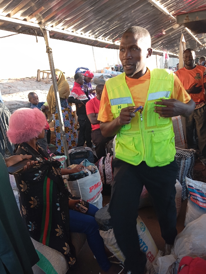 Under a corrugated metal roof, a man in a neon yellow vest and orange shirt speaks with a pen in hand. He is surrounded by people, some standing and some sitting on large bags, and wearing various clothing. A woman with a pink hat sits, draped in a black shawl. Luggage bags are visible. The scene appears crowded and could be an outdoor market or transport hub.