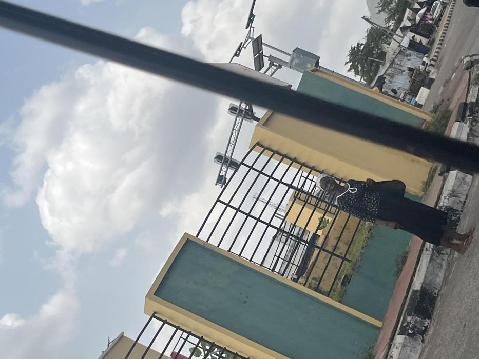 The scene, set in Lokoja, Nigeria, captures an adult individual standing on a paved surface adjacent to a white and black painted curb