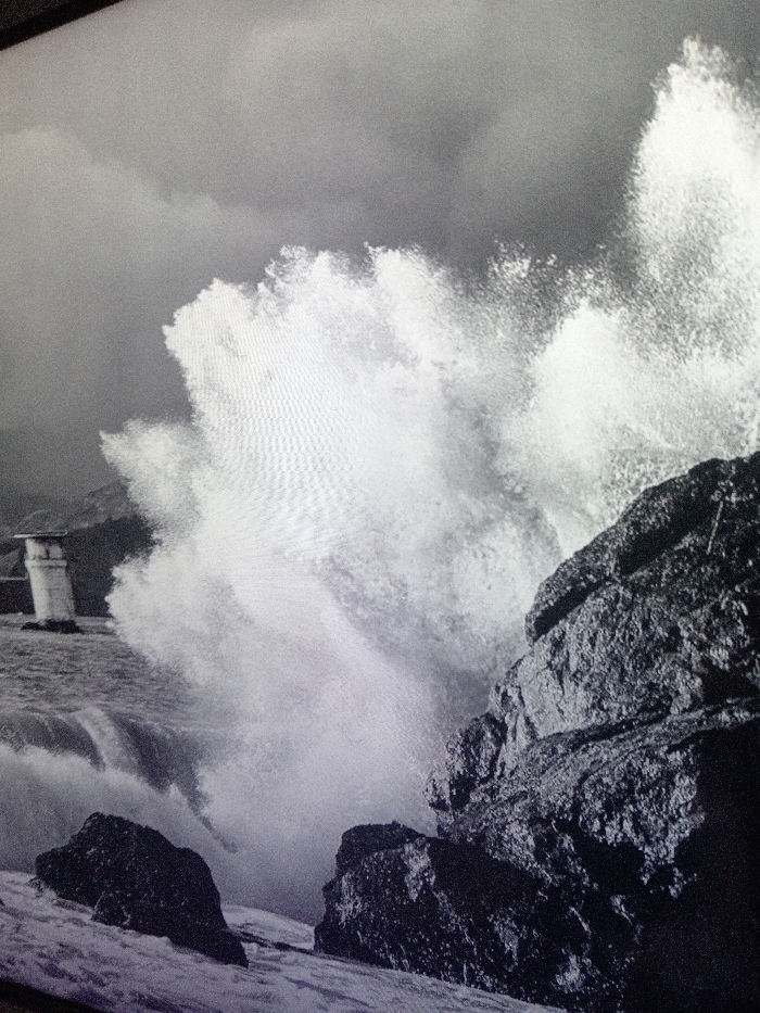 A black and white photograph captures a dramatic seascape. A large wave crashes against dark, jagged rocks in the foreground. Behind the wave, a small, white structure resembling a lighthouse stands on a low-lying island amidst turbulent waters. The sky is overcast with ominous clouds, enhancing the sense of raw power and untamed nature.