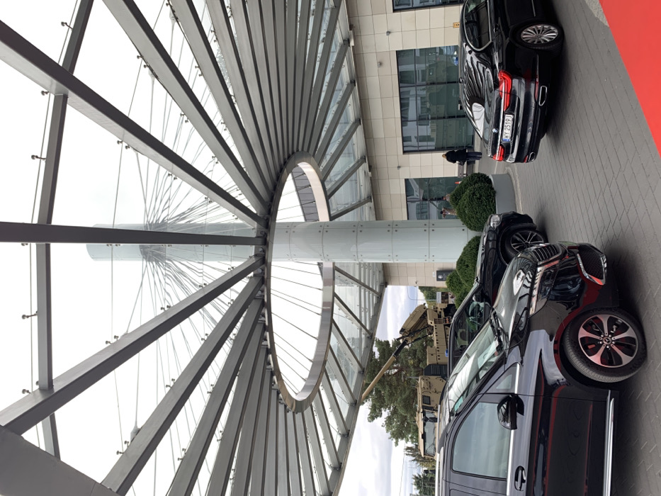 The image depicts the entrance area of the Marriott Hotel in Warsaw, Poland, located at Aleje Jerozolimskie 65/79. A large, circular, modern canopy structure, supported by a central column and radial metal beams with glass panels, extends over the paved driveway. The canopy features a network of cables descending from its central support. On the paved driveway, a red carpet is visible in the foreground, extending towards the building entrance. Several vehicles are present: * In the immediate foreground, a black Mercedes-Benz V-Class minivan is partially visible, facing towards the right. * Behind the minivan, a dark SUV (possibly a BMW X-series) is parked. * To the right, a black BMW 7 Series sedan (license plate WY 2519J) is parked, angled towards the left, with its rear visible. In the background, behind the civilian vehicles and under the canopy, a large, tan-colored military-style vehicle, appearing to be a self-propelled artillery system or missile launcher with a long barrel/arm, is partially visible. The building facade is modern, featuring light-colored horizontal panels and large, dark-tinted windows. Two individuals are discernible near the building entrance; one person in dark clothing is walking away from the camera towards the entrance, and another is partially obscured further inside. Manicured green bushes are planted in beds along the building's base. The sky above is overcast and light gray.