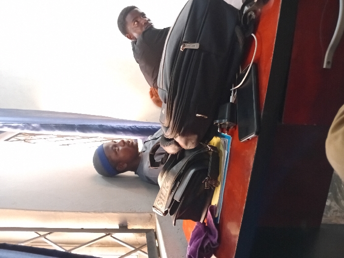 An indoor scene in Minna, Nigeria, features two young males seated in a room with white walls, illuminated by natural light entering through a barred window on the left
