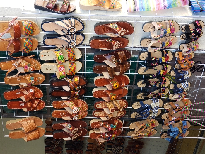 A display of handmade leather sandals, arranged neatly on a wire rack