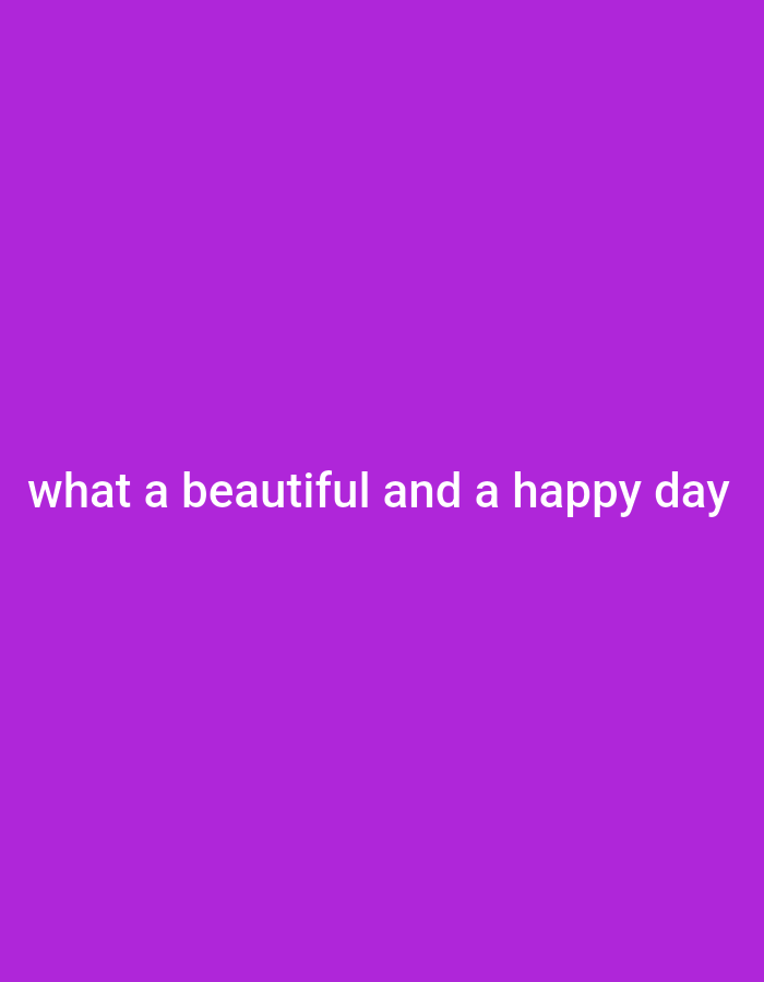 The image displays a solid, uniform background of purple color (specifically, a vibrant magenta or strong purple hue). Centered horizontally near the bottom of the frame, white, sans-serif text is present, reading: "what a beautiful and a happy day". There are no other subjects, objects, people, actions, interactions, or environmental details visible. The scene is a purely textual graphic on a colored background, located in Unknown, Unknown.