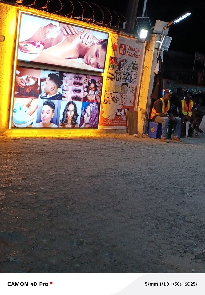 An outdoor night scene reveals a brightly lit sign advertising beauty services. Images depict facials, hairstyles, and eyelash extensions. Adjacent to the sign is a "Village Market" poster advertising healthy products. Nearby, several men wearing reflective vests are seated, one on a blue container. A street lamp illuminates the area above them. The ground is a textured pavement, and the scene is captured with a "CAMON 40 Pro" camera at 57mm, f/1.8, 1/50s, and ISO 257.