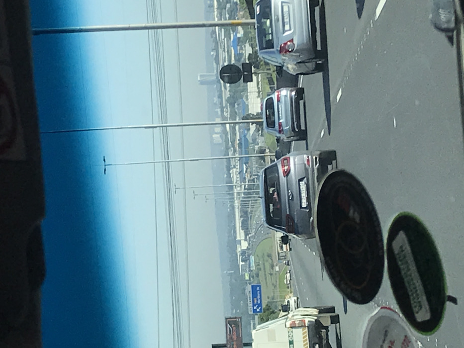 A highway scene shows multiple silver cars in adjacent lanes, viewed from the front passenger seat. Power lines parallel the road. The sky is clear, and a hazy cityscape lies in the distance, dominated by a tall building. Stickers are affixed to the windshield. A road sign for Sandton and Marlboro Dr. is visible. A white truck is partially visible on the bottom.