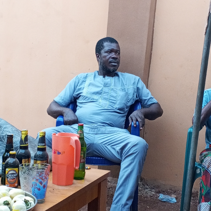 The scene depicts an outdoor gathering in Orlu, Nigeria. An adult male with dark skin, a short beard, and dark hair is seated in a blue plastic monobloc chair, wearing a light blue traditional tunic and trousers with embroidered patterns. He maintains a relaxed posture, with his arms resting on the chair's armrests, and is observed looking towards the right side of the frame. In front of the seated man is a light brown wooden table. Arranged on the table are several items: four dark glass bottles with yellow/gold caps (at least one identified as 'CHAMP MALTA' and another as 'LEGEND'), one green glass bottle with a red label (partially visible as 'HERO'), an orange plastic pitcher, and two clear glass tumblers, one featuring a blue design. Additionally, a white, shallow dish holds multiple small, white, oval-shaped food items, some garnished with green leaves. A partial view of another individual, similarly dressed in light blue attire and seated in a green plastic chair, is visible on the far right of the frame. The background consists of a plain light peach-colored wall. The ground beneath the chairs is exposed earth. To the left of the main subject, a crumpled dark grey tarp or cloth rests on the ground, and a dark vertical pole is present on the far right.