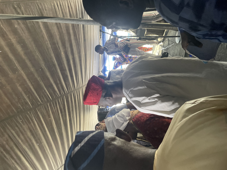 People are inside a tent, presumably at a gathering. Men are wearing traditional attire including caps of varying styles. One man is wearing a red cap and a white robe. Another wears a blue striped cap. The scene captures a moment of reverence or attention, as many heads are bowed. A musician wearing a striped shirt plays an instrument in the background.