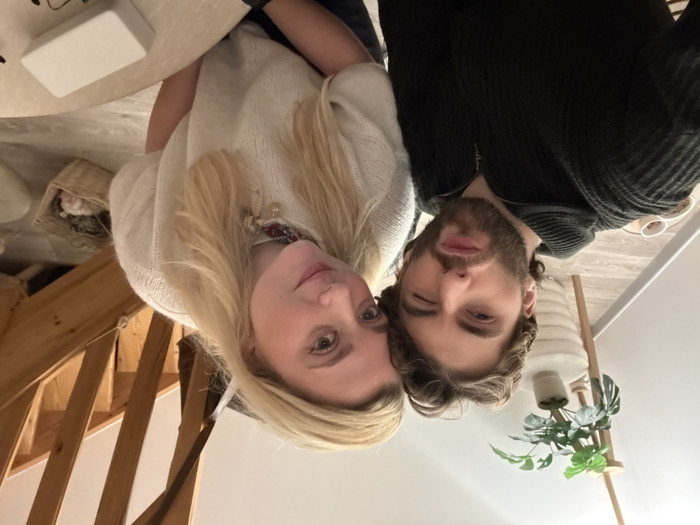 A man and a woman pose closely together, heads nearly touching. The woman has fair skin and long blonde hair. She wears a white knit sweater. The man has a beard, dark hair, and is winking. He wears a dark sweater. The background includes a wooden staircase, a round table with a white box on it, a woven basket, and a small plant stand with a potted plant. The image is rotated 180 degrees.