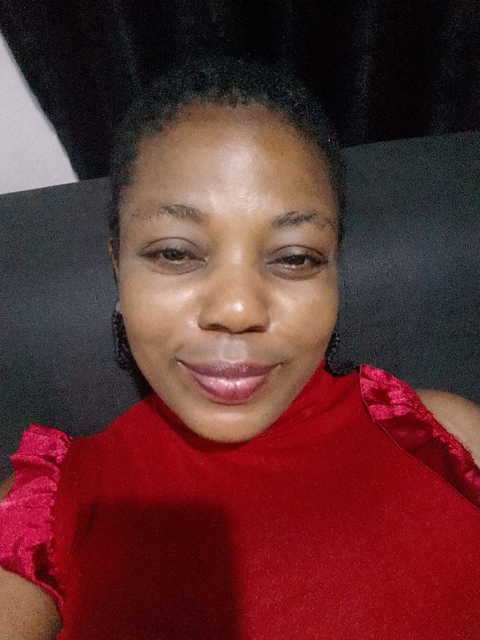 A close-up, front-facing portrait features an adult female with a medium-dark complexion and dark, braided hair styled off her face. She is wearing a high-necked, red sleeveless top constructed from a plush fabric, possibly velvet, with ruffled or gathered detailing on the shoulders. Her lips are full, glossy, and slightly parted, showing a subtle upward curve. Her dark eyes appear heavy-lidded or partially closed. The background is predominantly dark and indistinct, suggesting an indoor environment. A lighter, off-white or light grey angular surface is visible in the upper left background, contrasting with the dark, uniform surface dominating the rest of the background. No specific visual cues within the image confirm a location in Warri, Nigeria.