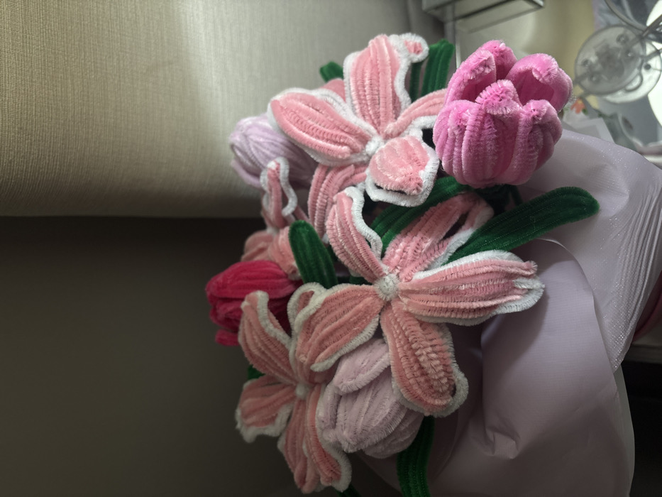- "A bunch of pink, white, and green pipe cleaner flowers are arranged together" by FM-3sGQI2, licensed under CC BY 4.0
