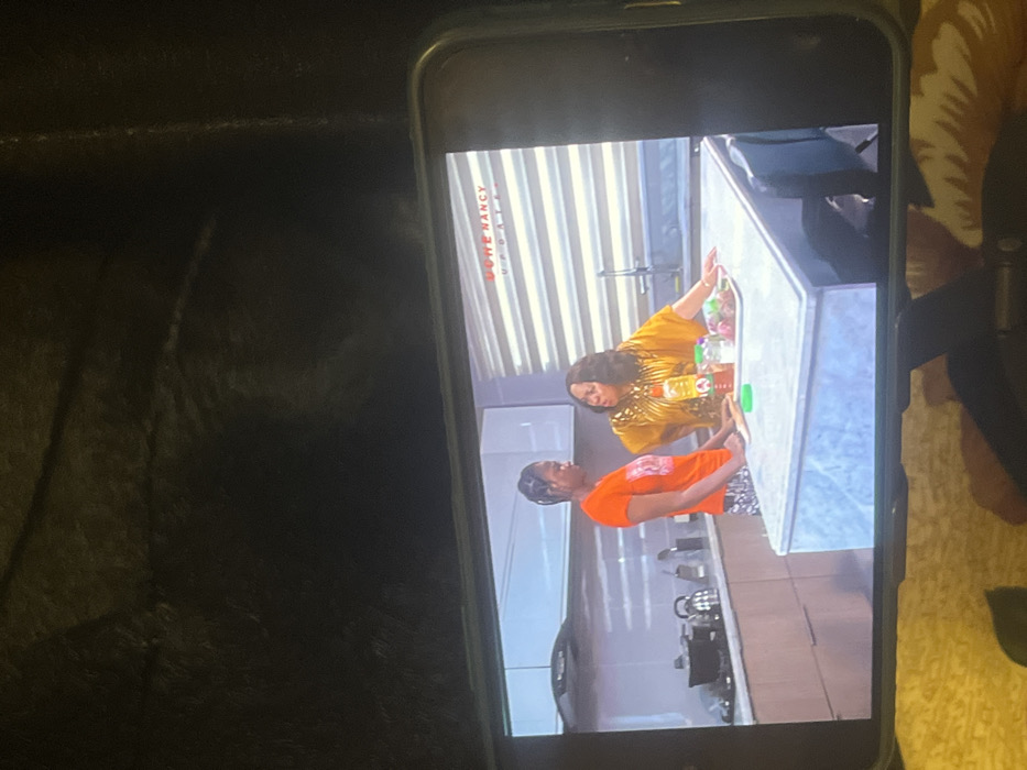 A phone displays a scene from the "More Nancy" show. Two women stand at a kitchen counter. One wears an orange shirt, and the other, a gold patterned top. Cooking ingredients and utensils are visible on the counter and behind them. The backdrop includes a modern kitchen design with a gray countertop, white cabinets, and stainless steel appliances. A person in a suit is partially visible in the background.