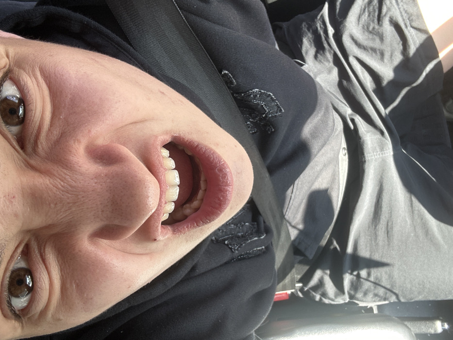 The image presents a close-up, top-down view of an individual inside what appears to be a vehicle in Verinsko, Bulgaria. The subject has fair skin and brown eyes, with a facial expression characterized by a wide-open mouth revealing upper and lower teeth, a wrinkled nose, and raised eyebrows. The individual is wearing a dark-colored hooded garment and dark shorts. A dark seatbelt extends diagonally across the upper torso. Direct sunlight illuminates the scene, casting shadows across the clothing and interior surfaces, including a light-colored car seat component partially visible on the left.