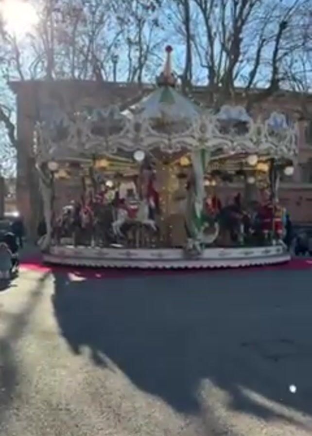 carousel spinning in an outdoor setting. The carousel is adorned with lights and detailed carvings and paintings. The platform beneath it is covered in a red material. Trees surround the carousel and a building is visible in the background. The sun is shining brightly, casting shadows on the ground. People can be seen walking in the background. The camera is mostly static.