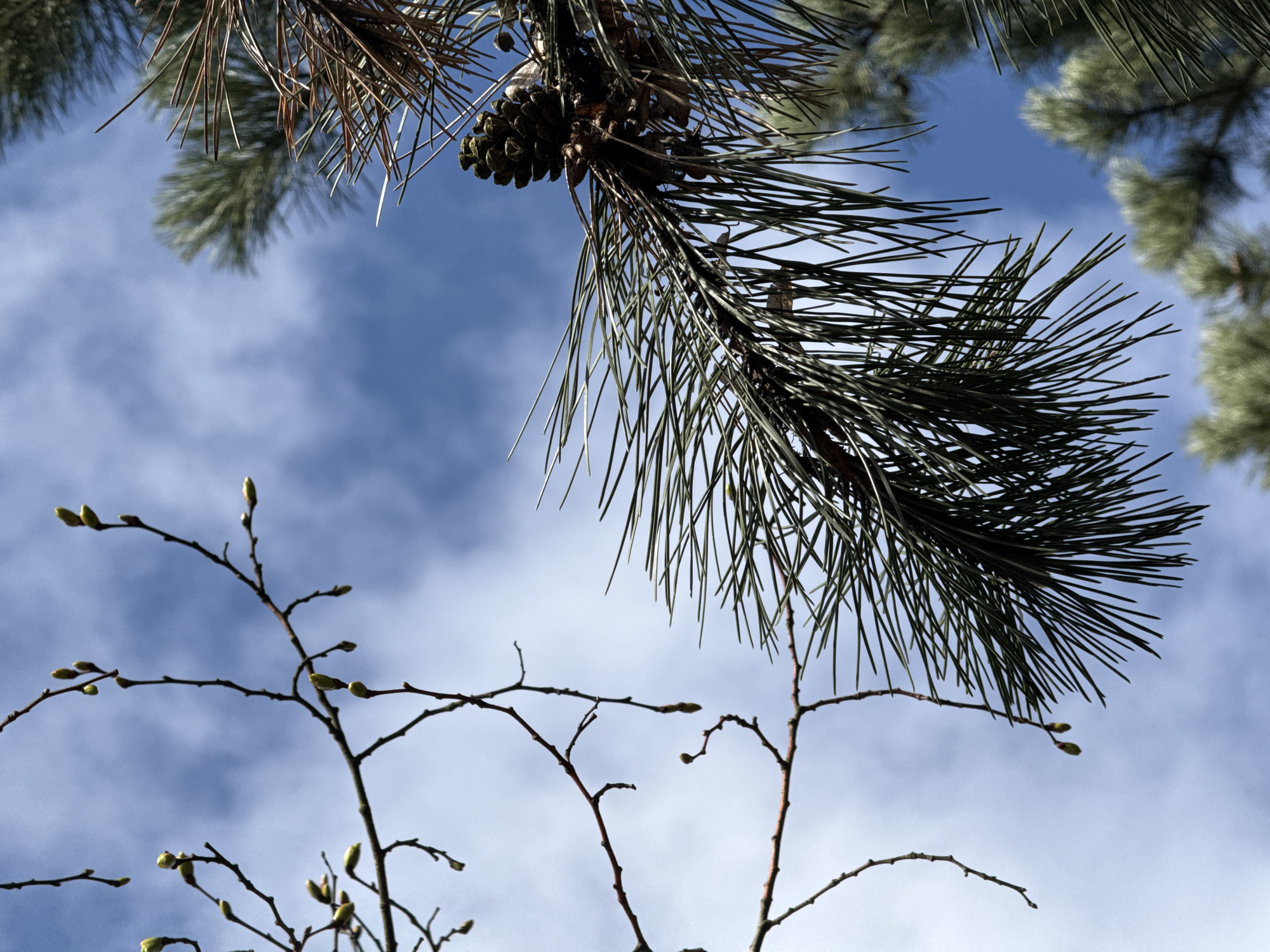 The image is taken from a low-angle perspective, looking up at a partly cloudy sky. A pine branch with long needles and a pine cone hangs down from the upper part of the frame. Below the pine branch are thin, bare branches with small buds, suggesting early spring. The scene appears to be outdoors in a natural setting, though the exact location in Esch-sur-Alzette, Luxembourg, cannot be determined from the image alone. There are no people visible, and the focus is on the interplay of the branches against the sky.