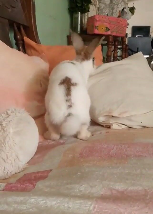 A white rabbit with brown spots is on a bed