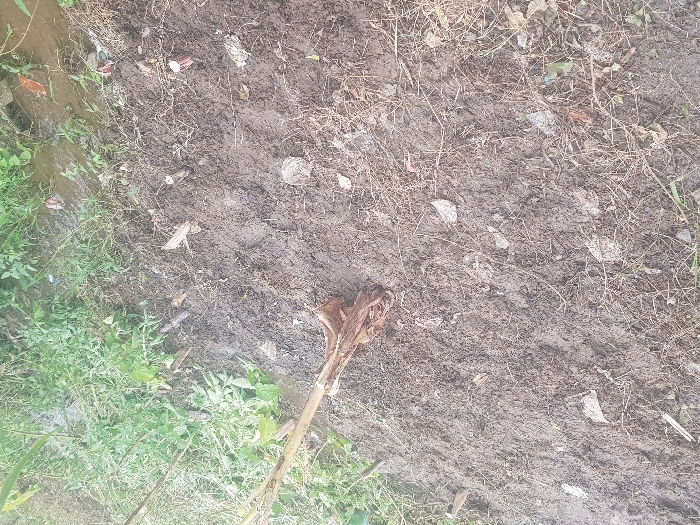An outdoor scene in Adankolo, Nigeria, depicts a section of wet, dark brown, muddy ground. In the lower-left, a fibrous, light brown plant stump with exposed roots is partially embedded in the mud. Several truncated plant stalks, light in color and approximately 5-10 cm in height, are visible embedded in the soil along a diagonal line from the lower-left to the center. The muddy surface is interspersed with scattered organic debris, including dried leaves and twigs, and inorganic litter, such as white and light-colored fragments, possibly paper or plastic. To the left and upper portions, a dense growth of green, leafy vegetation, likely weeds and grass, borders the muddy area. In the upper-right, a narrow, murky water channel or drainage ditch is present, containing some scattered debris, including red and white fragments, along its banks and within the water. No individuals are visible. The ground shows signs of disturbance, consistent with foot traffic or recent clearing.