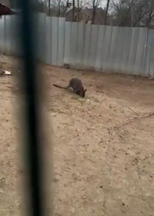 n outdoor enclosure. A small kangaroo is seen eating grass, then runs away. Another kangaroo appears briefly in the background. A peacock then appears, displaying its feathers. The enclosure is dirt, surrounded by a metal fence and some trees. There is a small brick structure visible on one side.