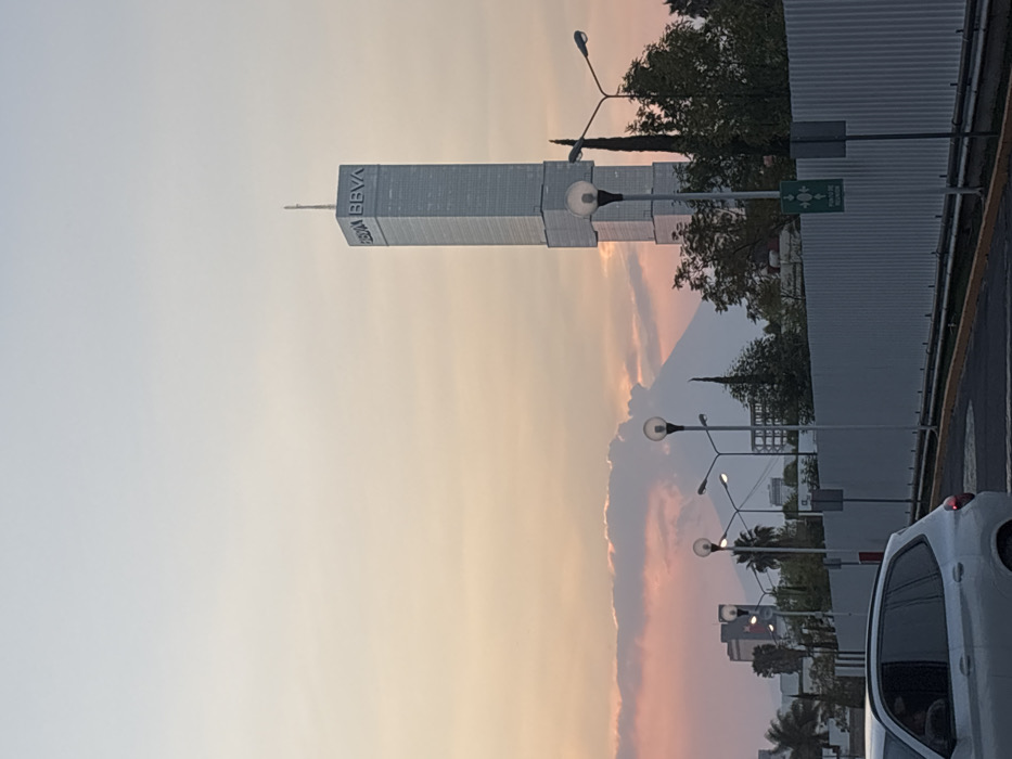 A towering BBVA building dominates the skyline, set against a gradient sunset sky. Street lights line a road beside a tall, light grey wall. A partial view of a white car is visible on the right side. The photograph is taken from a low angle, looking upwards towards the sky and the towering building.
