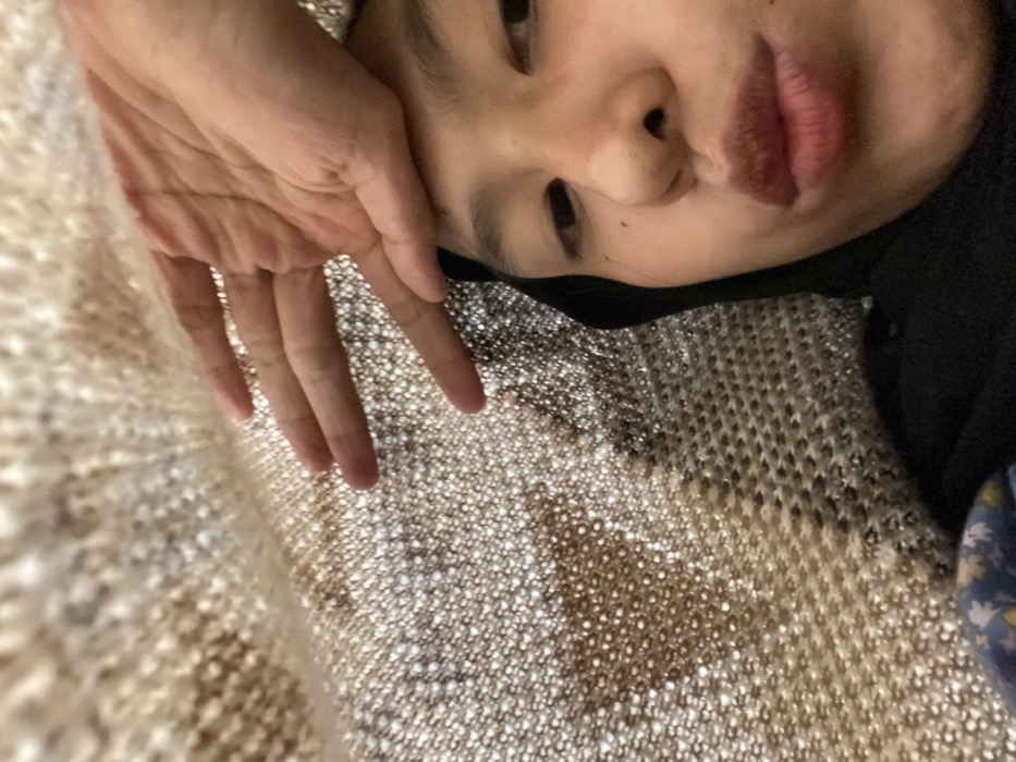 The image displays a close-up, high-angle view of a single individual in an indoor setting located in North Jakarta, Indonesia. The subject, a young person with medium skin tone, is positioned in the lower right quadrant of the frame, showing their upper right torso and face. They are wearing a black hooded garment. Their right hand is placed on their forehead, with fingers extended upward. Their lips are pursed into a "kissing" gesture, and their eyes are open, directed towards the camera. The background consists of a textured, light-colored fabric, likely upholstery or a blanket, exhibiting a patterned weave with small, raised elements in shades of white, beige, and brown. A small section of a blue fabric with yellow and white patterns is visible on the lower left of the frame. The individual is actively posing, engaging directly with the camera.