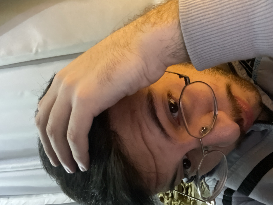 A person lies on their back, looking up at the camera with a hand resting on their head. The person wears round glasses and a light gray sweater with stripes. The skin tone is fair, and a light beard is visible. The background is indistinct, appearing to be a white or off-white surface.