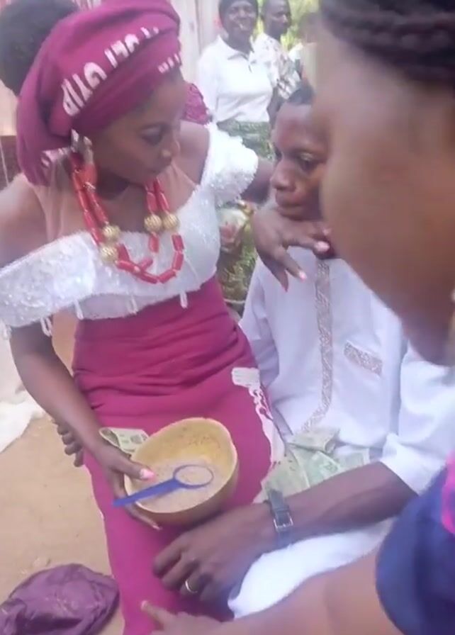 bride and groom at what appears to be their wedding ceremony. The bride is sitting on the groom's lap. She is wearing a white and maroon dress with traditional red beads, and a maroon headwrap. The groom is wearing a white outfit with embroidery and a watch. The bride holds a wooden bowl with a spoon, appearing to feed the groom something from it. People are in the background. There are bills of money placed on the groom's forehead and held in his hand. The setting looks like an outdoor area, possibly a yard or garden. Text at the bottom corner reads "Infinix NOTE 30 Pro."