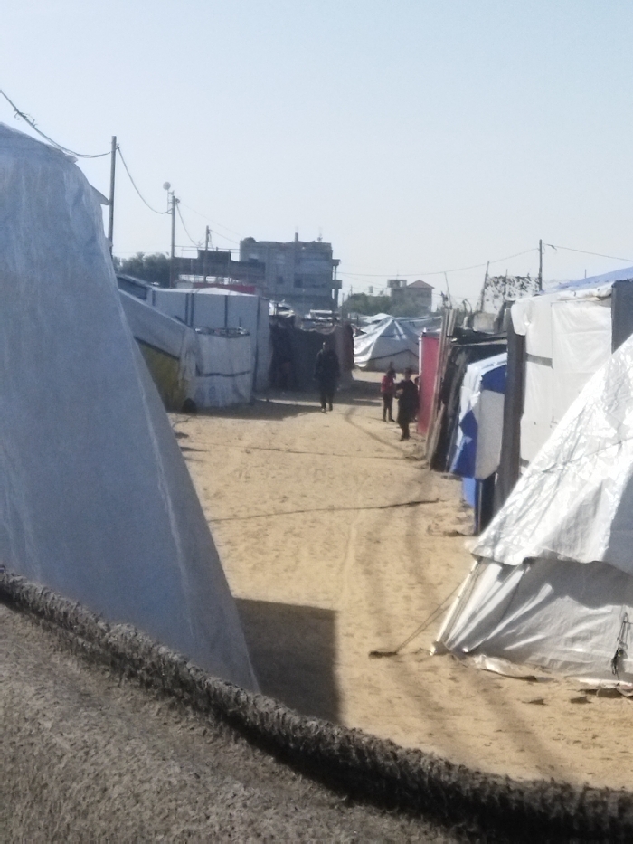 - "The image depicts a temporary settlement or camp in Khan Yunis, Palestinian Territory, characterized by makeshift shelters and sandy ground under a clear, bright sky" by FM-AOrI72, licensed under CC BY 4.0