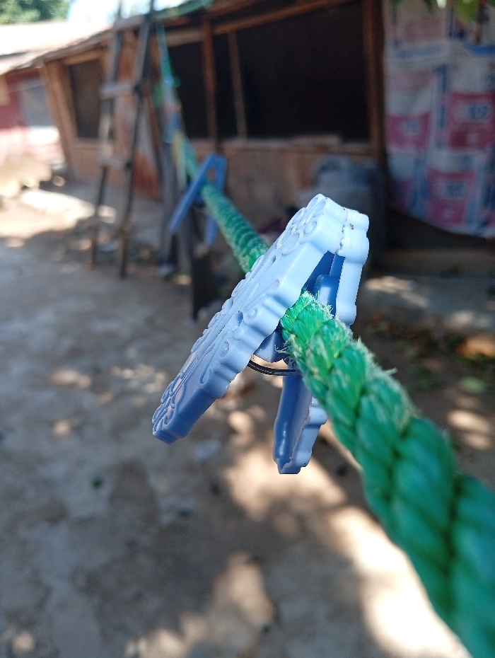 This image depicts an outdoor scene in Unknown, Unknown, captured under direct sunlight. In the foreground, a light blue plastic clothes clip, adorned with embossed scrollwork patterns, is affixed to a thick, braided green rope. The rope extends diagonally from the upper left to the lower right. A second, identical light blue plastic clip is visible further along the rope in the blurred midground. The primary clip's internal metal spring mechanism is visible. The background, largely out of focus, features a single-story structure, likely a dwelling or storage building, with wooden or corrugated metal siding and a pitched roof. Dark, open window apertures are visible in the structure. A wooden ladder leans against the building to the left of the frame's center. A dark cylindrical object, possibly a barrel, is situated near the structure, and a stack of white bags with red and blue markings is visible to the right. The ground is composed of light-colored bare earth or dirt, exhibiting pronounced shadows. No individuals are present.