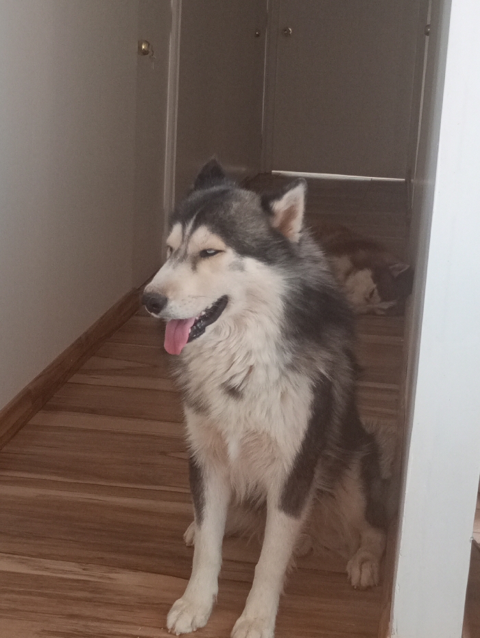 The image displays an indoor scene, reported to be located in the city of Pozo Almonte, Chile. The primary subject is a large, thick-coated dog, consistent with a Siberian Husky or Alaskan Malamute breed, exhibiting a gray/black and white fur pattern. This animal is seated upright in the foreground, oriented towards the left, with its mouth agape and a pink tongue partially extended. Its eyes are partially closed, with one blue iris visible. Its front paws rest on a light brown, wood-patterned floor. A dark brown wooden baseboard lines the bottom of the left wall. In the background, positioned further down a dimly lit corridor, a second dog is partially visible, lying prone. This animal exhibits a predominantly brown or reddish-brown coat. The walls in the immediate vicinity are light, neutral-colored. Two closed doors, each fitted with a metallic doorknob, are discernible on the left wall in the background. No human subjects are present, and no direct interactions are depicted between the two canids.