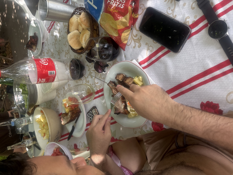 A table is set with a white tablecloth adorned with red stripes and floral patterns. A variety of food items including meat, salad, bread, and chips are scattered across the surface, alongside drinks and dining utensils. A person's hand wielding a fork is visible, suggesting someone is in the midst of eating. A mobile phone and a smart watch also sit on the table. The overall scene appears to capture a casual meal or picnic setting.
