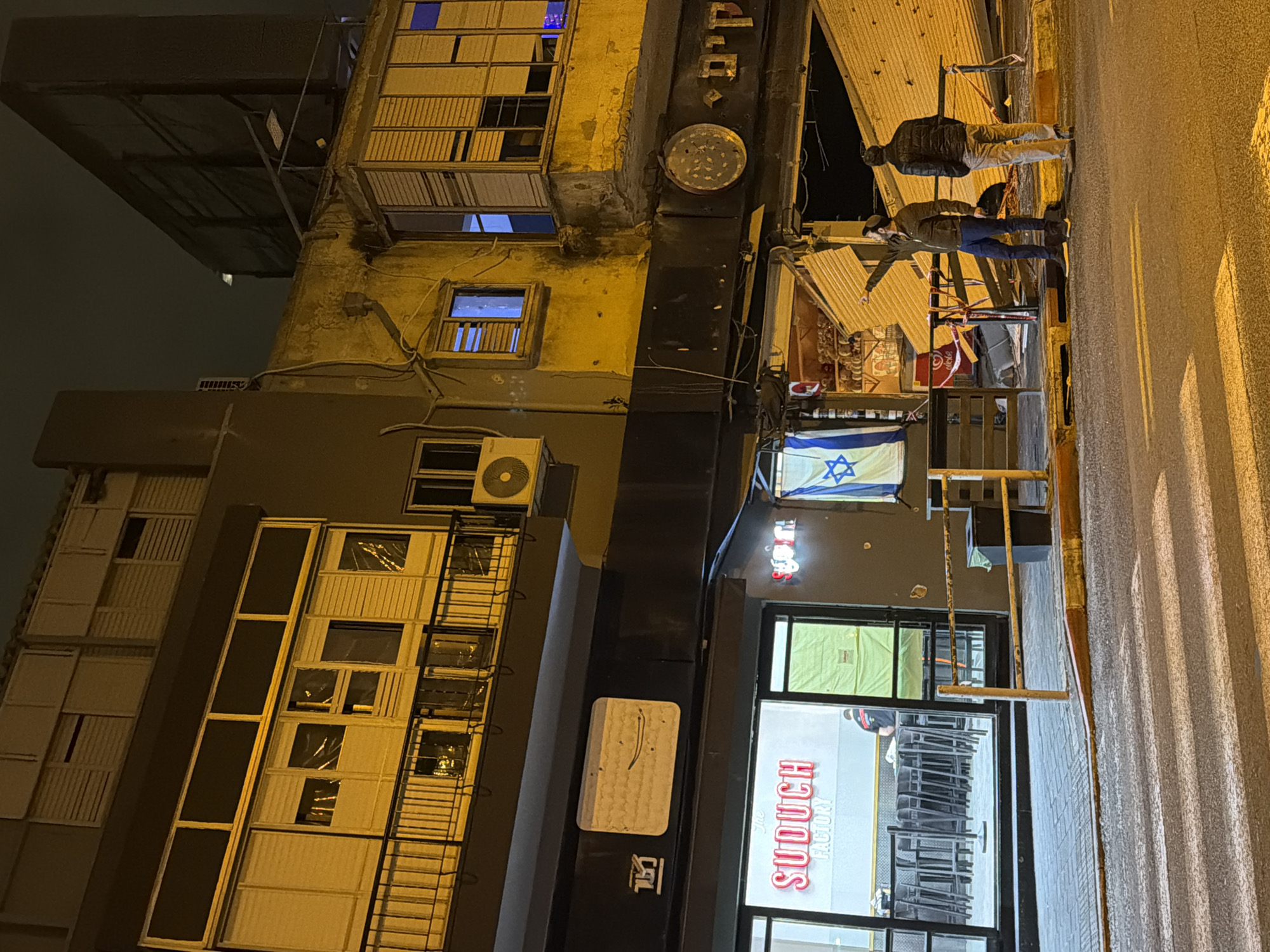 The image captures an urban scene at night in Givatayim, Israel. Two individuals are walking along a brightly lit street next to a building with a prominent sign reading "THE SUDUCH FACTORY". The building has an Israeli flag hanging near its entrance. Above the storefront, the building's facade shows architectural elements, including rows of windows and a ventilation system. The overall illumination suggests an active street environment.