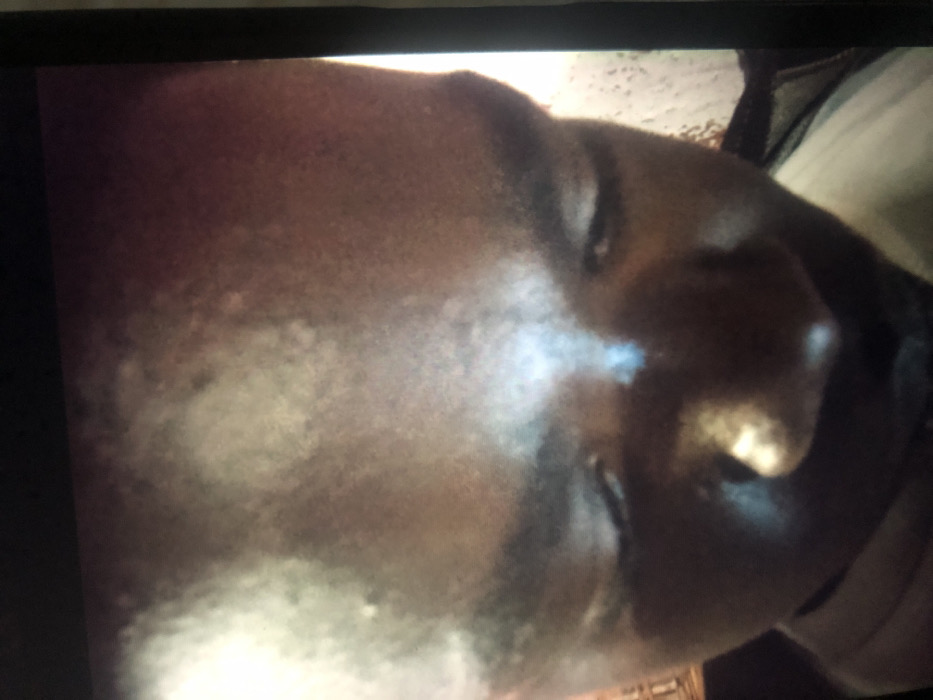 A close-up, slightly angled view captures a person's face. The individual has dark skin, closed eyes, and a prominent nose with reflected light. The face exhibits varying tones and textures. A white object is visible on the lower left side of the image. The top of the frame has a dark border.